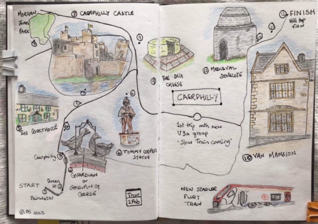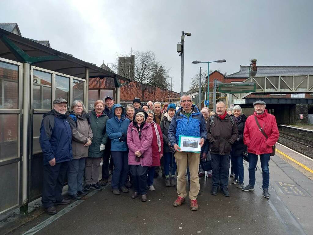 The Slow Train Coming group’s inaugural trip took place on Feb 2nd 2023 up to Caerphilly. We think those attending numbered about 35 though the group photo looks smaller as there were little ones at the back! The route was one adapted from Peter Finch’s book ‘Walking the Valleys’ and was about four miles in total, but was such that people could drift away at different points.