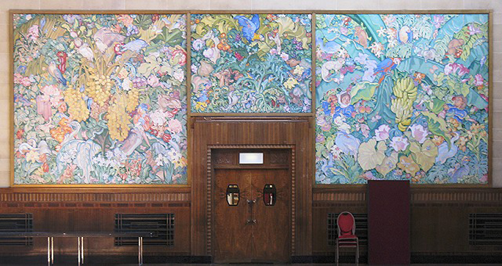 We found the most interesting pictures in a nearby corridor. They were smaller studies, squared up ready to be transferred onto the huge final panels. We could clearly see the progression of Brangwyn’s ideas as he included the details of people, plants and animals.