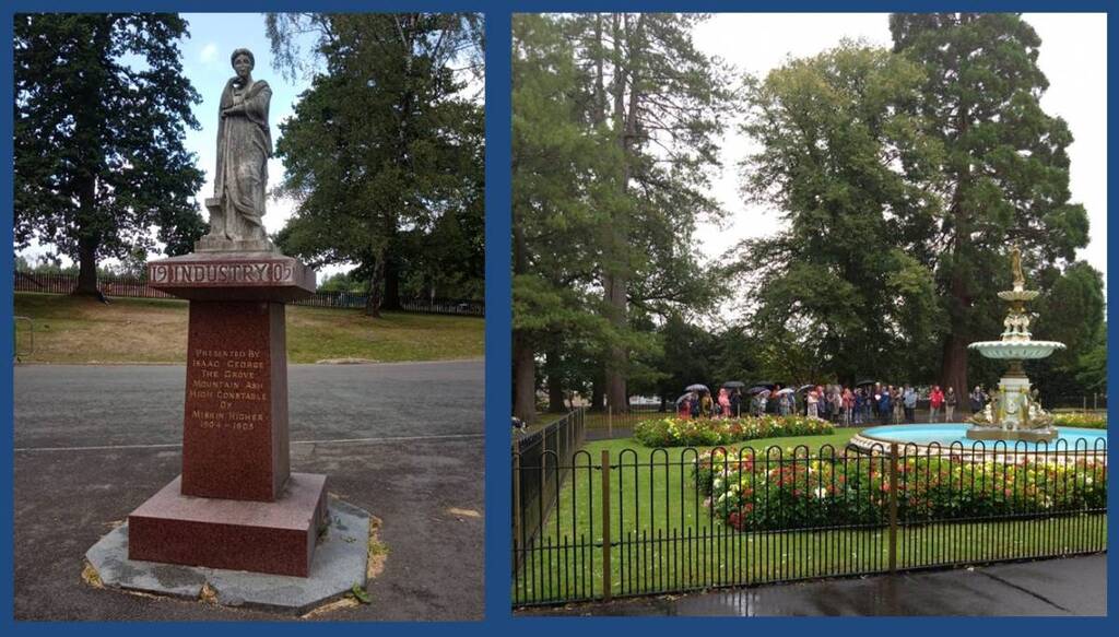 It was then a stroll up the hill to Aberdare Park where we learnt about the history of the park itself then William Lewis, 1st Baron Merthyr and the sculptor Sir Thomas Brock, up to the Spirit of industry (ex-drinking fountain) and final stop before lunch, the Coronation Fountain. After lunch we explored some more of the park including the history of the motorcycle racing event and the Gorsedd Circle. We also peered over the wall to see the plaque on the school dedicated to Dan Isaac Davies.