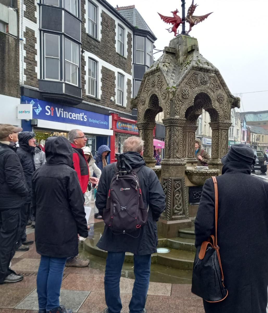 The rain arrived somewhat earlier than forecast so we had one talk in the shelter of Pontypridd station, which at one stage used to be the longest platform in the world. We donned our wet-weather gear and headed down into the town, pointing out the Ynysangharad War Memorial Park, unfortunately closed today as it recovers from the recent floods caused by Storm Bert.