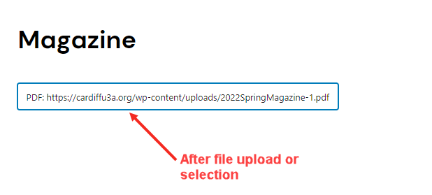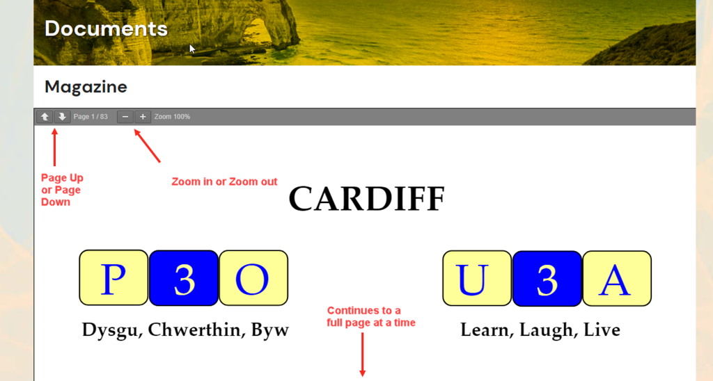 This feature allows for a PDF document to be embedded in a page or post and for the document to be displayed page at a time. The size of the displayed page can be altered with a zoom-in : zoom-out function. There is a small menu for these options at the top and bottom of each page.