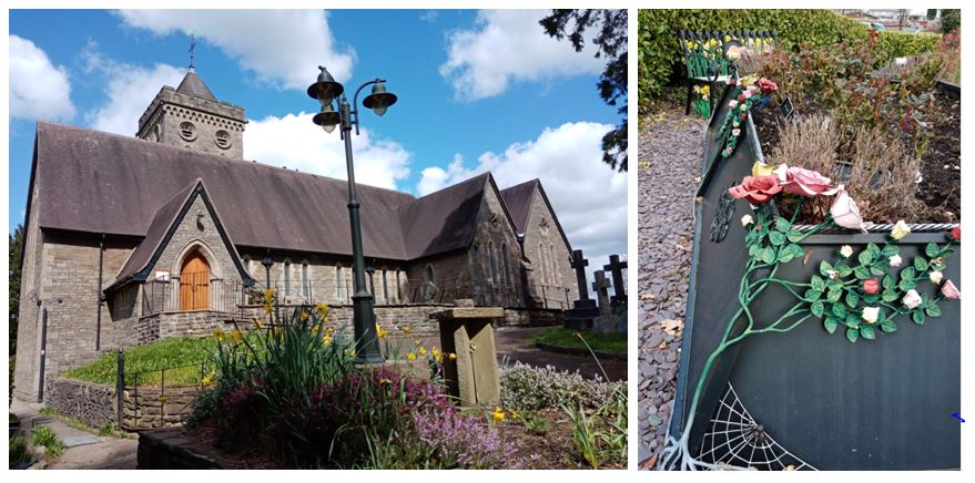 From the church we walked through the lovely churchyard and had a look at the unusual sculpture outside the church hall, then onto the oak leaf roundabout and then up into the town of Ystrad Mynach and a few more interesting sculptures.